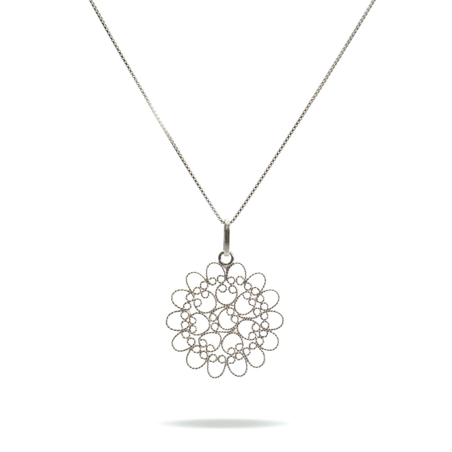 Carefully arranged caracoles—the signature element of Mompox filigree—build layers of subtle, geometric pattern. Step closer, and these orderly forms reveal themselves as lively loops of handworked silver wire.