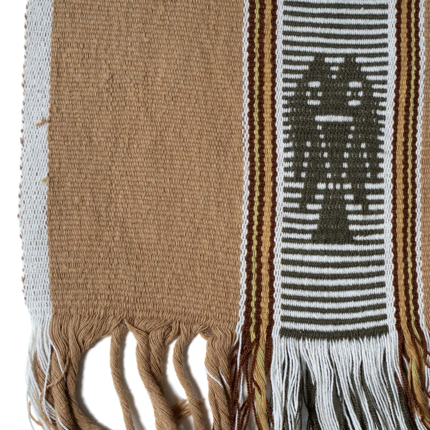 Sechura Coast Weave is born from one of the world's most dramatic landscapes — where the bone-dry Sechura Desert meets the cold swells of the Pacific. Hand spun and hand woven by descendants of the Chimu people of coastal Peru, this textile carries forward a tradition of over a thousand years. Woven entirely from rare Peruvian heirloom cotton varieties, no dyes have ever touched it — the warm brown field and ivory borders are the cotton's own colors, grown from ancient seed. Two bands of stylized fish flow down the cloth, a motif drawn directly from Chimu visual tradition. This is not a reproduction. It is a living continuation.