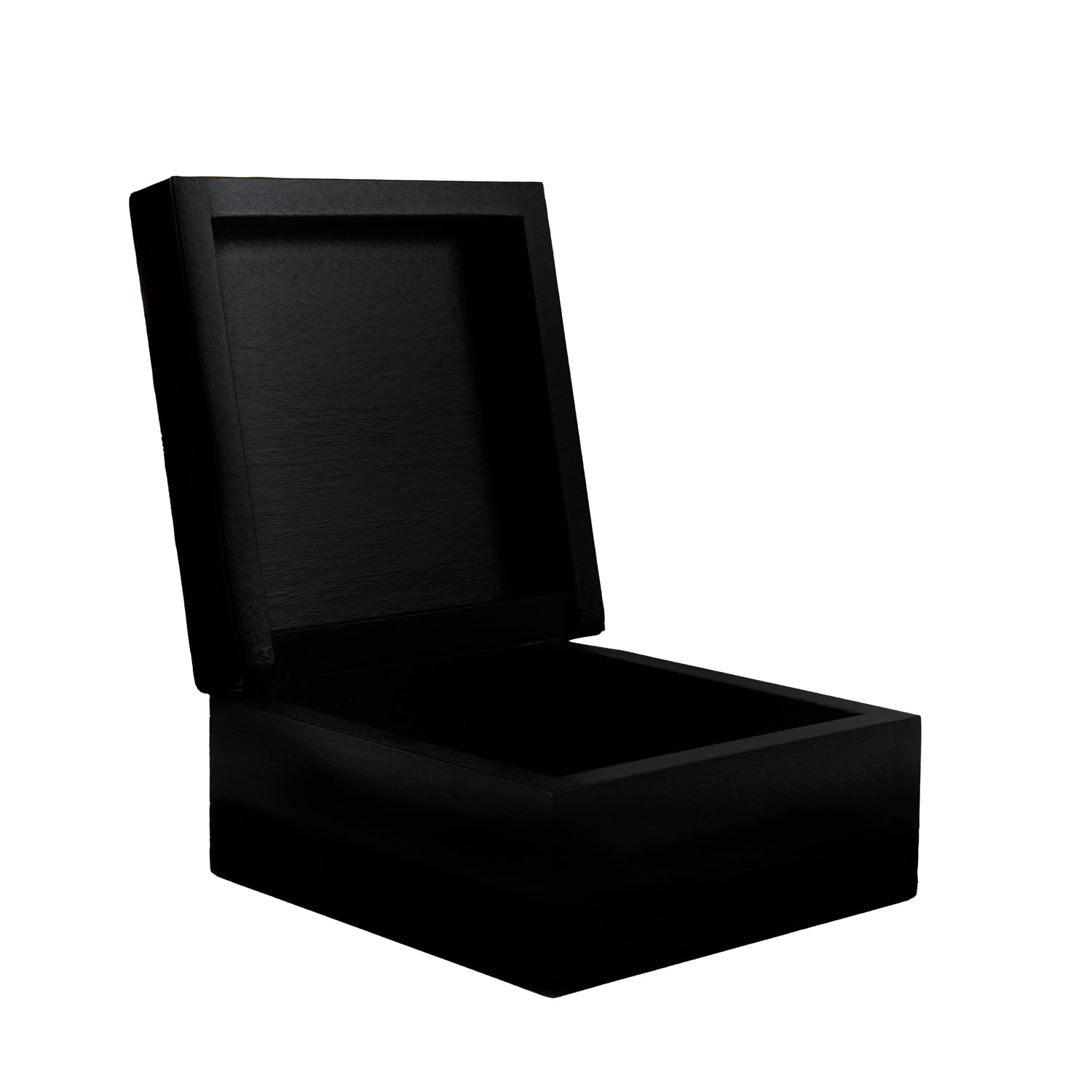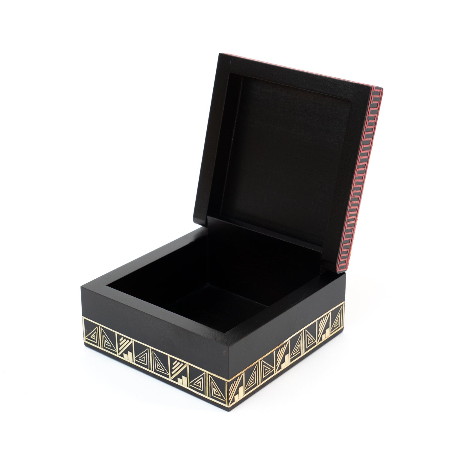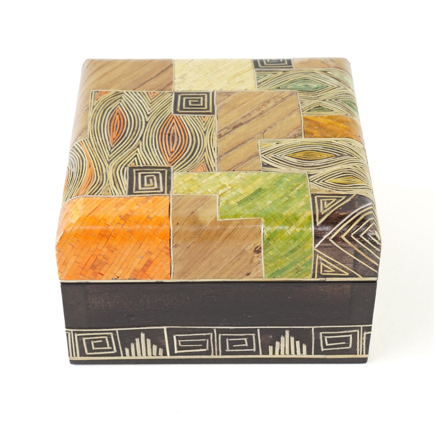 A sleek wooden box, decorated on the top and sides with intricate patterns of colored straw.
