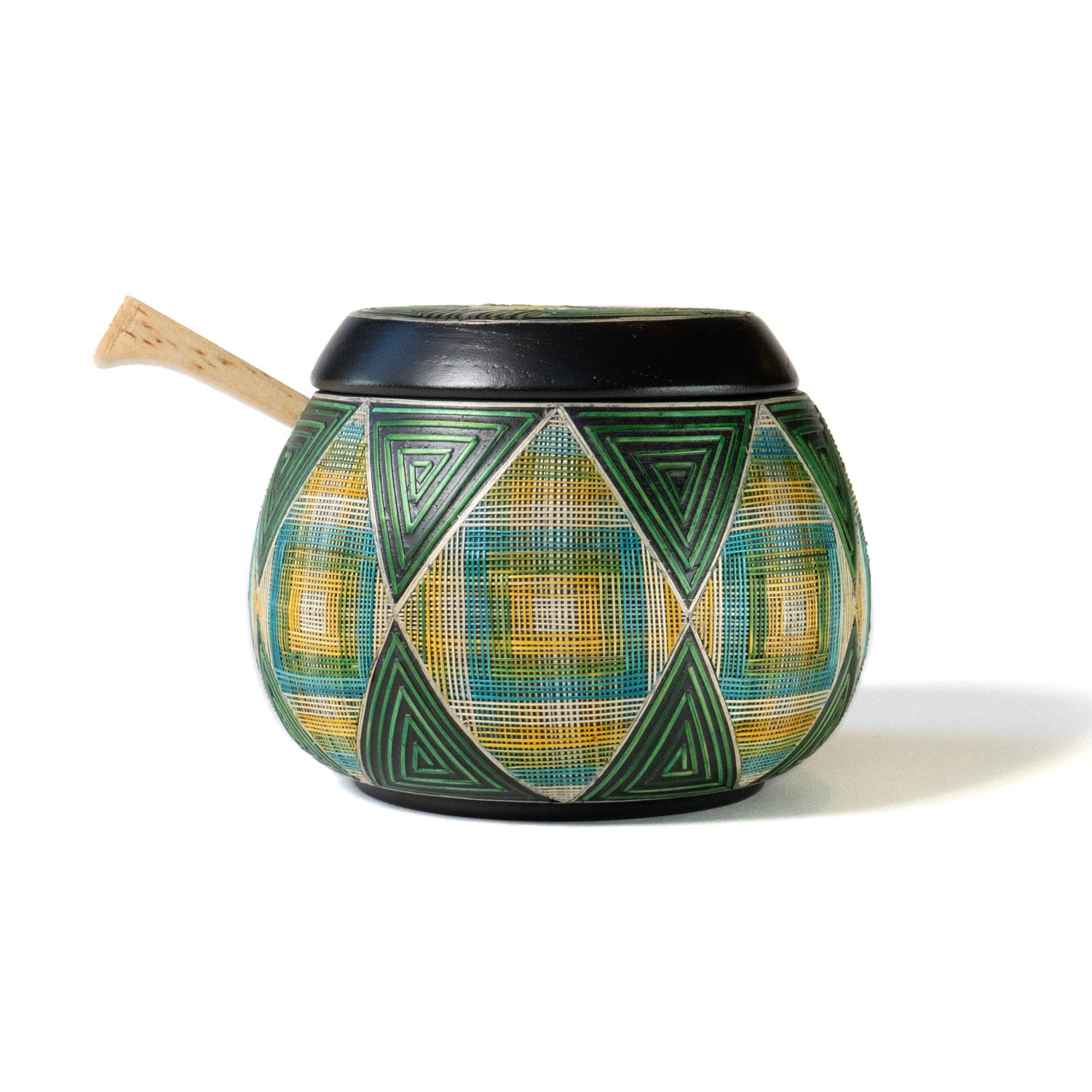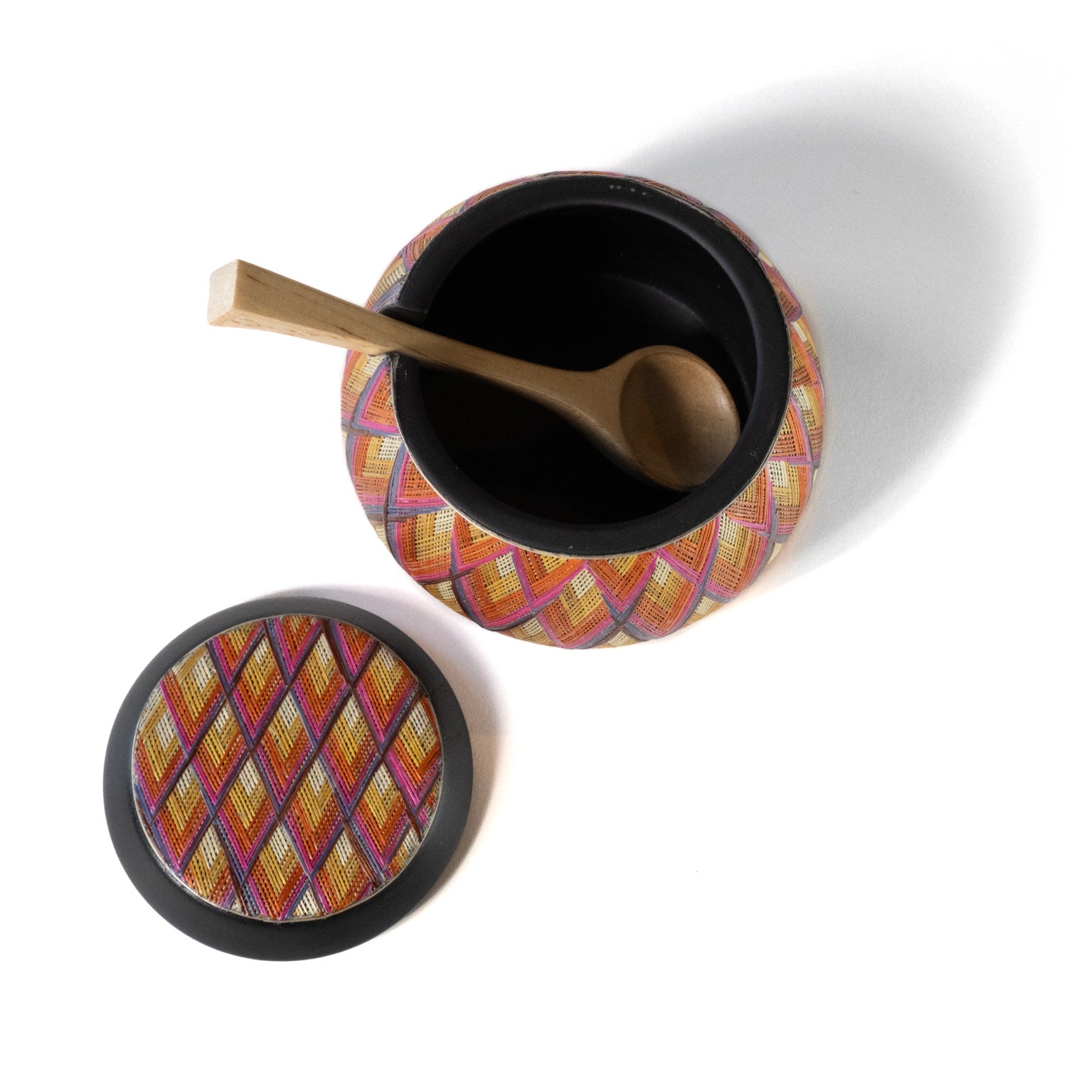 A functional art piece from Pasto, Colombia, this 3.5-inch-tall sugar bowl features a fitted lid and hand carved wooden spoon that rests neatly inside. The turned wood base is adorned with vibrant patterns in dyed wheat and barley straw, sealed with a glossy lacquer finish. Designed for use with sugar or honey.